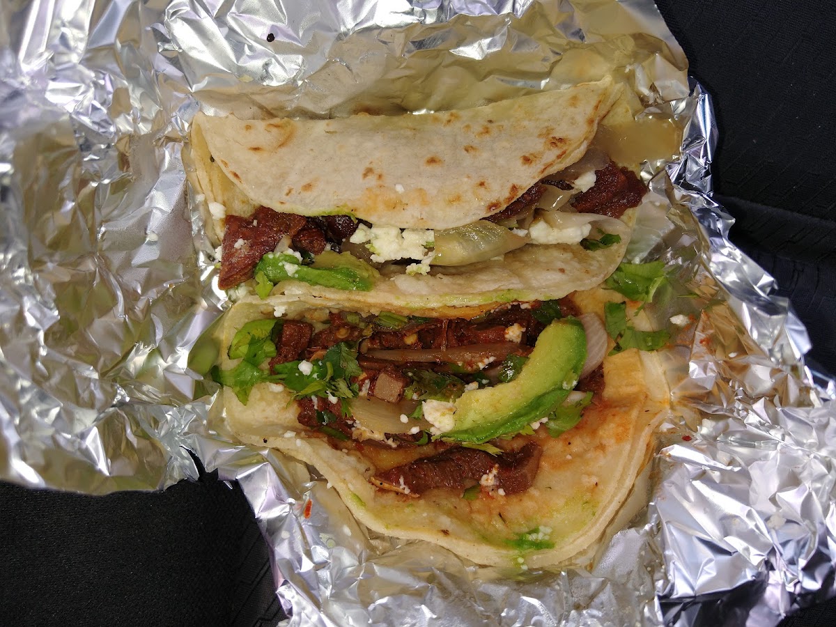 Taco De Lengua and Taco De Tripa with Avocado Slices Onion and Cilantro in Corn Tortillas